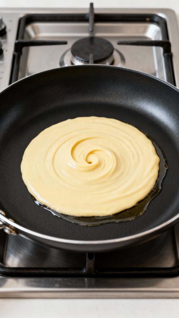 Use a small nonstick skillet (8–10 inch). Heat it on low to medium-low heat, not high. Lightly grease with oil or spray. Let the pan heat up for at least 2 minutes before adding batter—this helps prevent sticking.