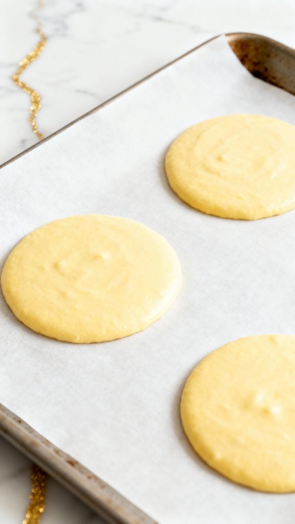 Line a baking sheet with parchment paper or a silicone mat. Pour the batter into 3 even circles, about 6–7 inches wide. Use a spoon or the back of a measuring cup to spread into thin, even rounds.