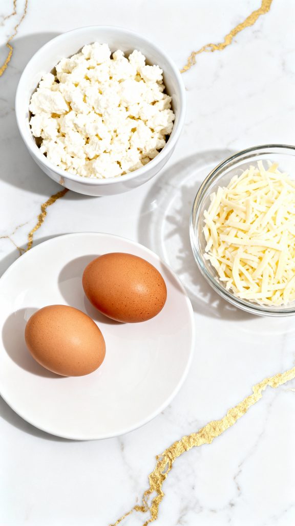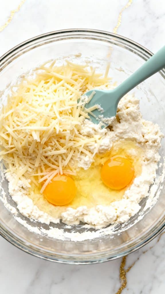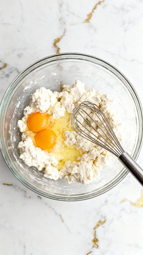 Pour the smooth cottage cheese into a mixing bowl. Crack in 2 large eggs. Whisk until fully combined.