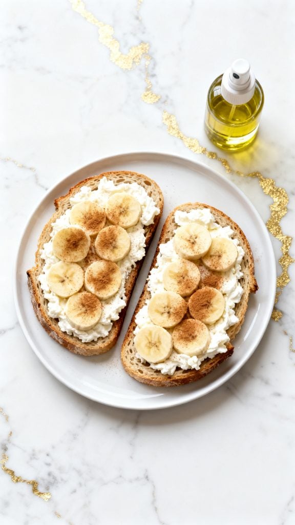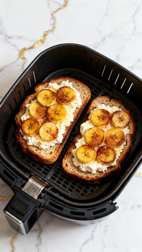 The whipped cottage cheese adds protein and creaminess, and because it’s light, it doesn’t weigh down the toast. The banana caramelizes slightly in the air fryer, bringing out natural sugars. The bread gets golden and crispy on the outside but stays soft in the middle.