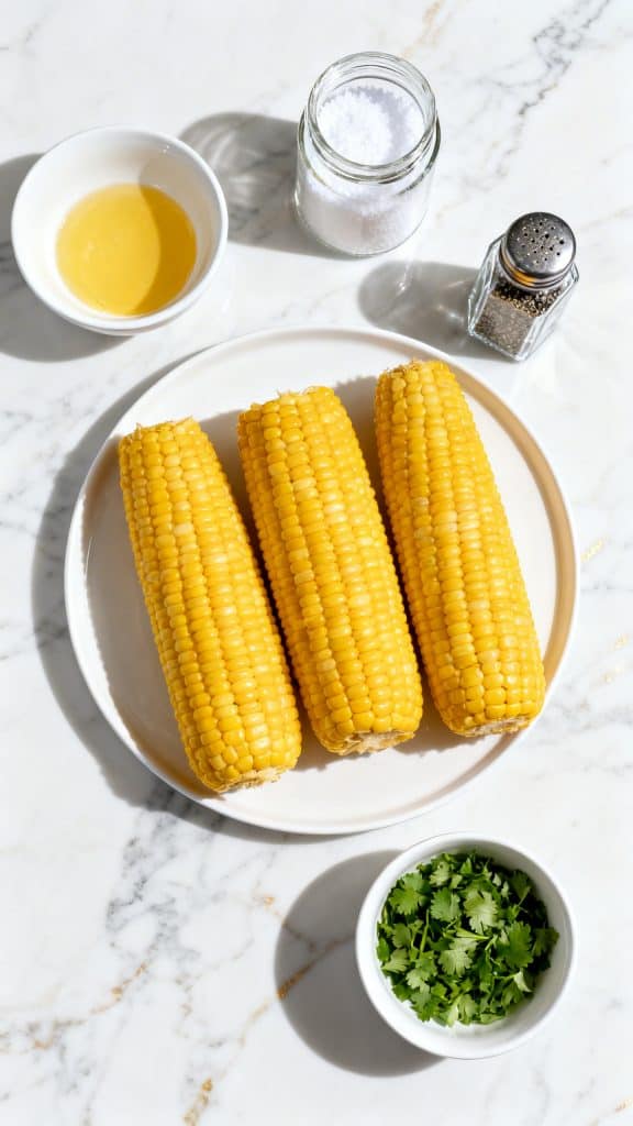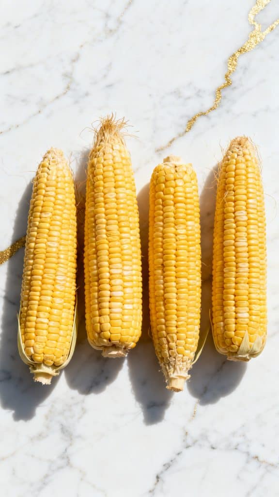Step 1 AI Image Prompt: Ultra close-up shot of 4 ears of corn on the cob with husks and silk removed, fully cleaned and patted dry, arranged side by side with a pair of tongs nearby, the full ears of corn completely in frame and not cropped out, a straight 90-degree top-down shot with no tilt, captured directly overhead, white marble with hints of gold, natural lighting