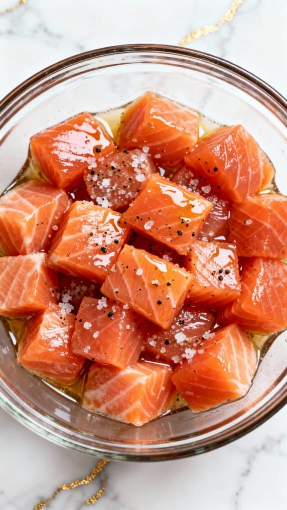 In a mixing bowl, combine 2 salmon fillets (cut into 1-inch cubes) with 1 tablespoon olive oil, 1/4 teaspoon salt, and 1/4 teaspoon black pepper. Toss to coat evenly.