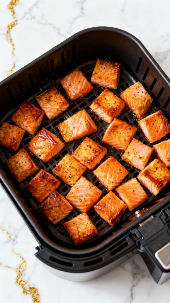 Place salmon cubes in a single layer in the preheated air fryer basket. Air fry at 400°F for 7–8 minutes, shaking halfway through, until golden and slightly crisp.