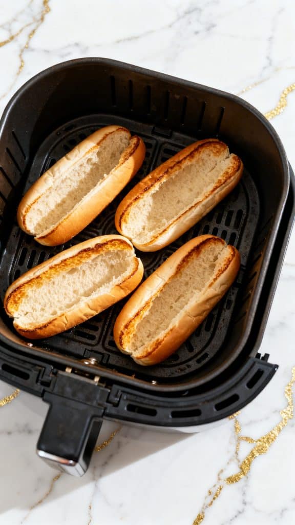 Open the 4 hot dog buns and place them in the air fryer for 1–2 minutes until warm and lightly crisp.