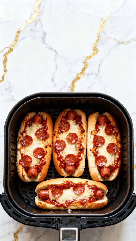 The air fryer uses hot moving air, so the buns toast quickly while the hot dogs heat through at the same time. The mozzarella melts fast because it has a good moisture and fat balance, which gives you that smooth stretchy top. The pizza sauce goes on before the cheese, which helps keep the hot dog juicy and gives the cheese something to cling to. A little butter on the bun helps the bread brown and adds that pizza-parlor flavor.