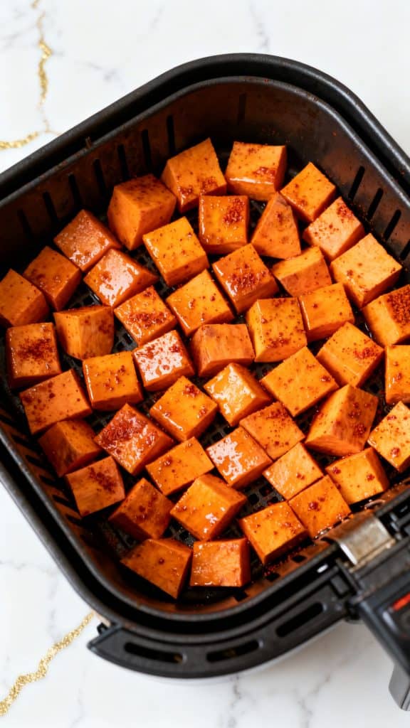 Preheat your air fryer to 400°F for 3 minutes. Spread the seasoned sweet potato cubes in a single layer in the air fryer basket. Cook at 400°F for 12–15 minutes, shaking the basket halfway through. The cubes should be golden brown and crispy on the edges.