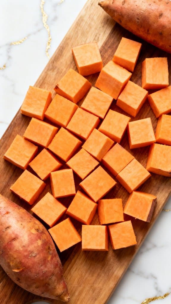 Peel 2 large sweet potatoes (about 1 ½ pounds total). Cut them into 1-inch cubes. Try to keep them about the same size so they cook evenly.