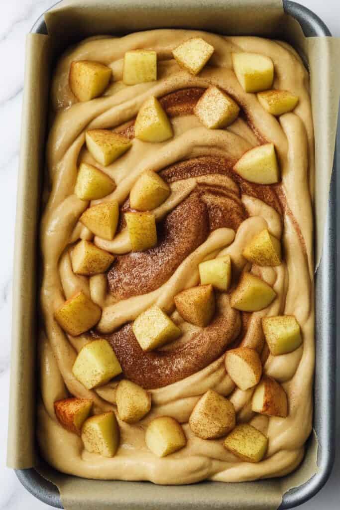 Pour half of the batter into a parchment-lined 9×5” loaf pan. Layer half the apple mixture, then half the cinnamon sugar. Repeat with remaining batter, apples, and cinnamon sugar. Use a knife to swirl everything together.
