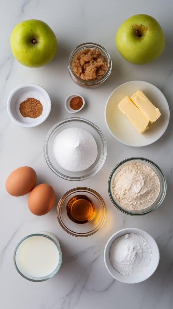 Ultra close-up shot of all ingredients for Amish Apple Fritter Bread including diced Granny Smith apples, brown sugar, cinnamon, white sugar, softened butter, 2 whole eggs, vanilla extract, all-purpose flour, baking powder, milk, powdered sugar, with a whisk, spatula, loaf pan, and two mixing bowls laid out on white marble counters with hints of gold, taken with an iPhone 15 Pro, top-down shot used by recipe bloggers.