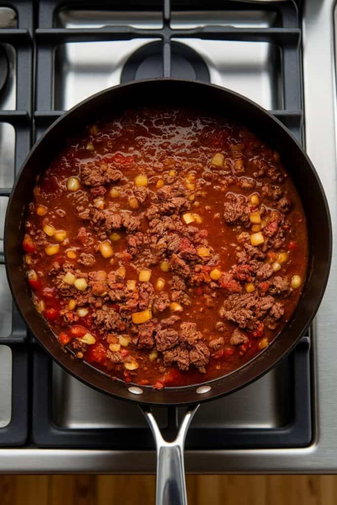 In a large skillet over medium heat, cook 1 lb ground beef and 1 diced yellow onion until the beef is browned and the onion is soft, about 8–10 minutes. Drain the excess fat.