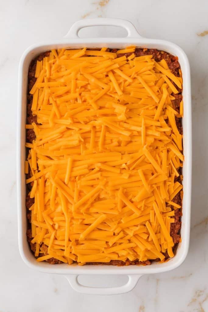 Grease a 9×13 baking dish. Spread half the noodle mixture in the bottom. Spoon over half the beef sauce. Repeat with remaining noodles and beef. Top with 1 ½ cups shredded cheddar cheese.