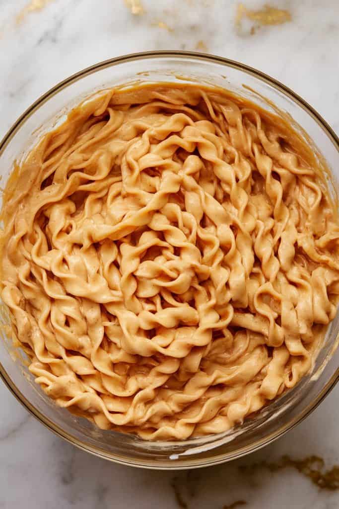 To the creamy mixture, add 3 cups cooked egg noodles. Gently fold the noodles into the mixture until evenly coated.