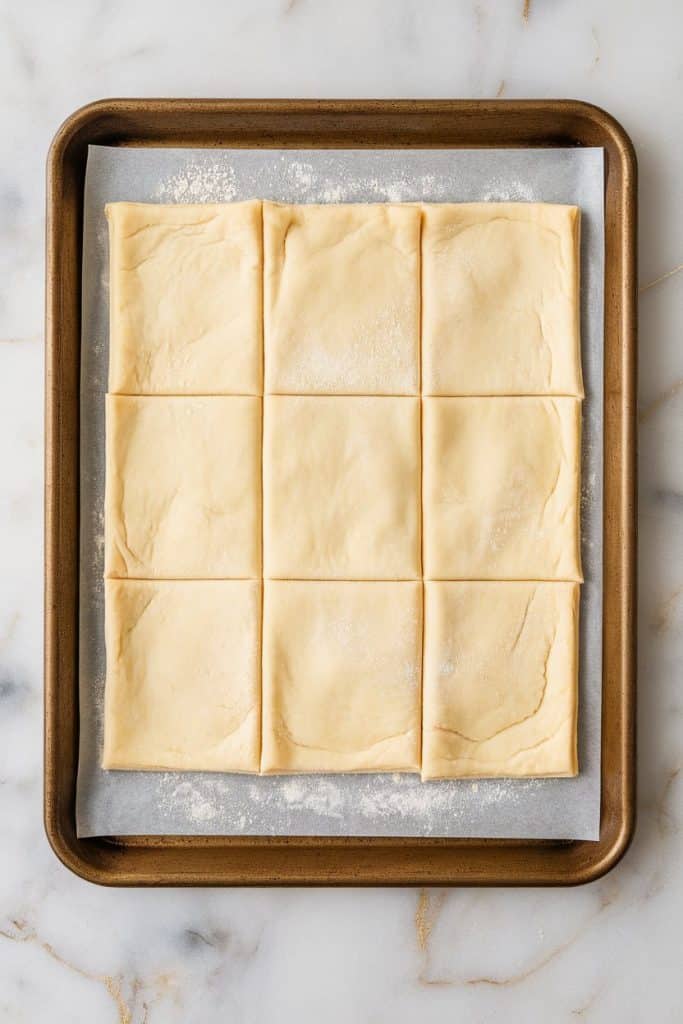Unfold 1 sheet of thawed puff pastry on a lightly floured surface. Cut into 9 equal squares.