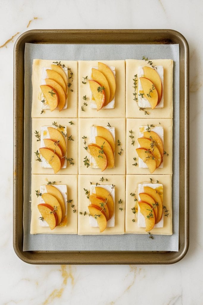 Place 1 cube of brie and 1 or 2 slices of the sautéed apple in the center of each puff pastry square. Sprinkle with a few thyme leaves if using.