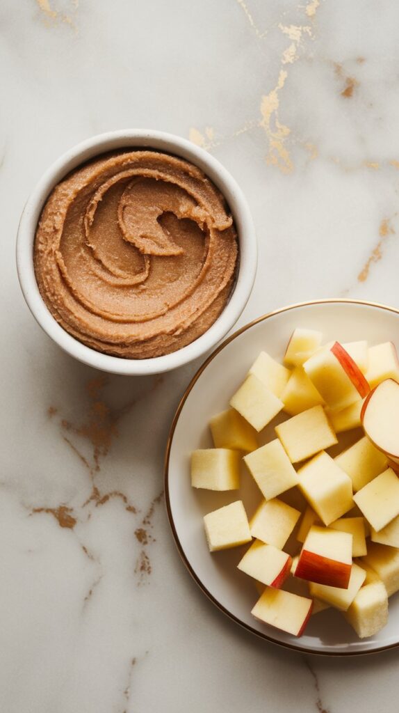 While the dough rises, mix ⅓ cup softened butter, ½ cup brown sugar, and 1 tbsp ground cinnamon in a bowl. Peel and dice 2 apples into tiny pieces.