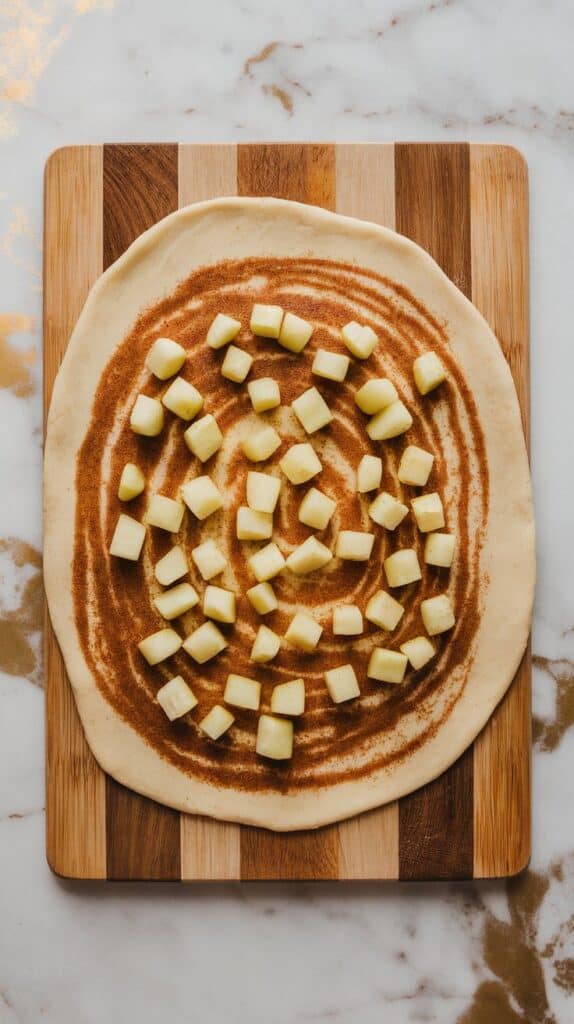 Once the dough has doubled, roll it out into a 14×9 inch rectangle on a floured surface. Spread the cinnamon sugar butter all over, then sprinkle with the diced apples. Roll up tightly from the long side.