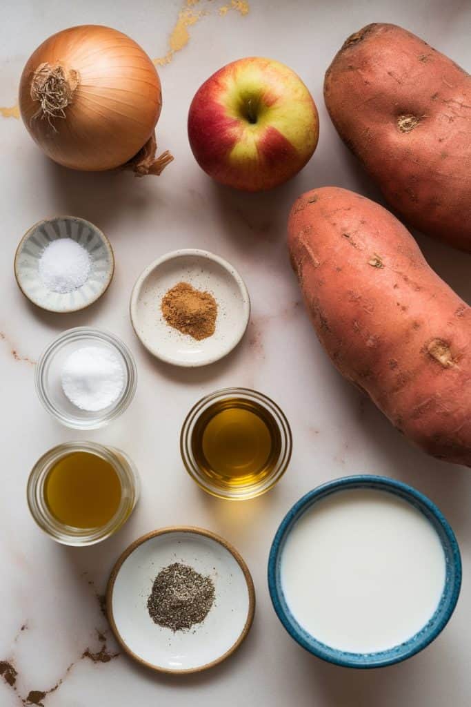 Sweet potatoes are loaded with natural starch, which thickens the soup when blended. Apples add natural sugar and pectin, which helps the texture get extra smooth. The cinnamon and nutmeg bring out the sweetness without overpowering the dish.