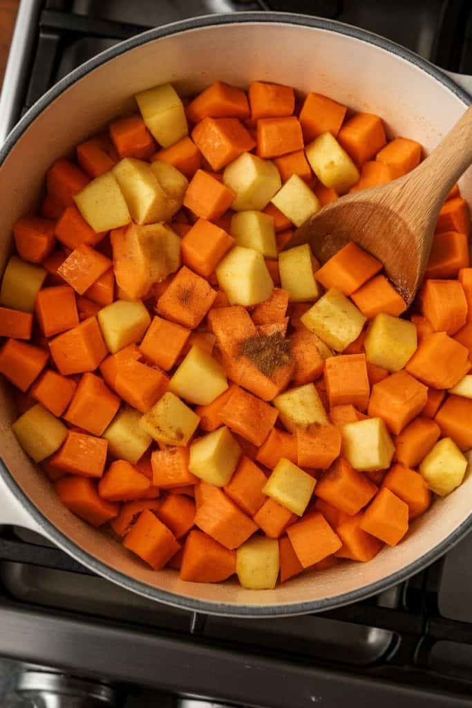 Stir in 2 peeled and diced sweet potatoes, 2 peeled and diced apples, 1/2 teaspoon cinnamon, 1/4 teaspoon nutmeg, and 1/4 teaspoon salt. Cook for 2–3 minutes, stirring occasionally.