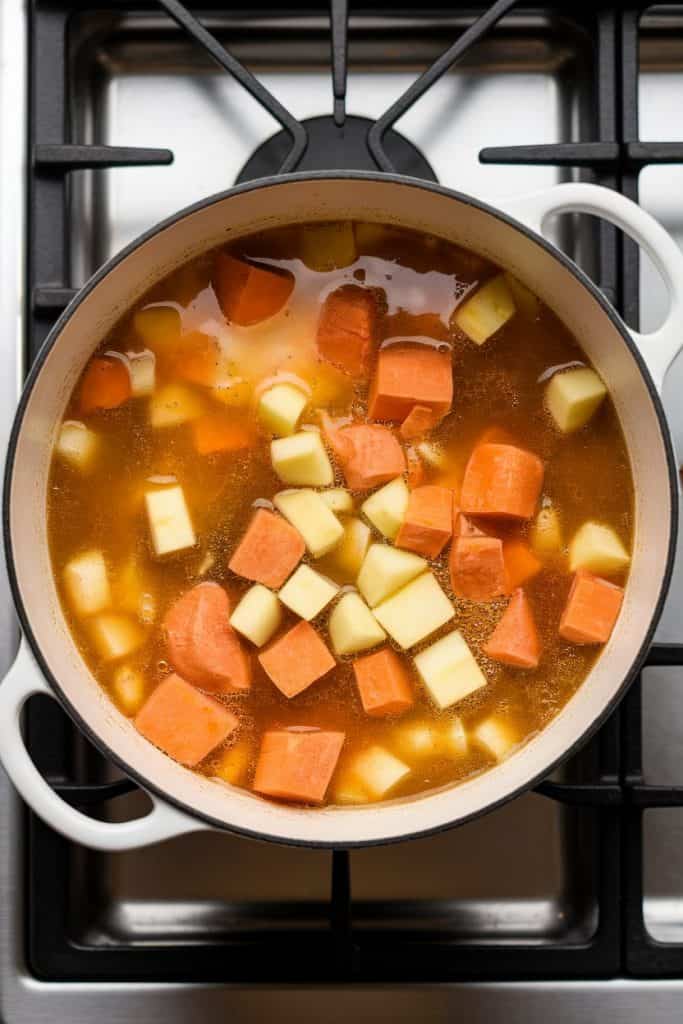 Pour in 4 cups vegetable broth. Bring to a boil, then reduce heat and let it simmer for 20 minutes, or until the sweet potatoes are fork-tender.