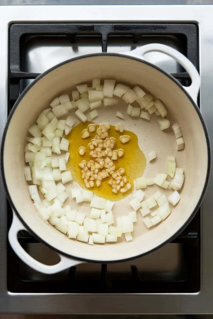 Heat 1 tablespoon olive oil in a large pot over medium heat. Add 1 chopped yellow onion and cook for 3–4 minutes, until softened. Stir in 2 minced garlic cloves and cook for 30 seconds more.