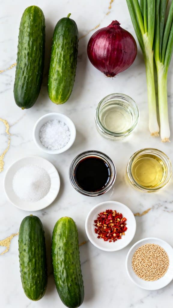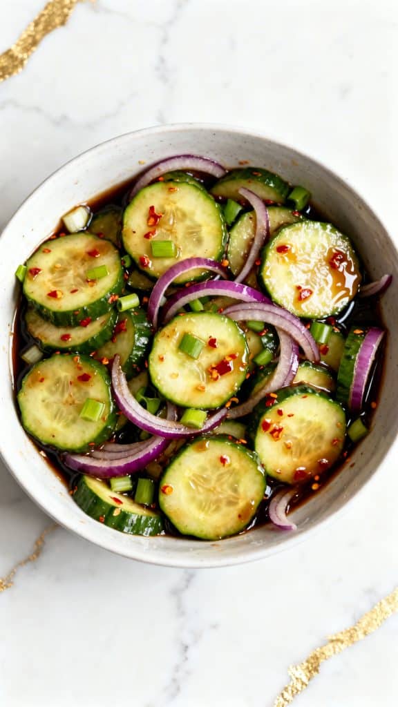Salt pulls water out of the cucumbers through a process called osmosis. This keeps them crunchy and stops the dressing from getting watery. The vinegar adds acid, which brightens flavor. The sugar balances the acid, and the sesame oil adds rich aroma. It’s all about balance—salty, sweet, tangy, and nutty.