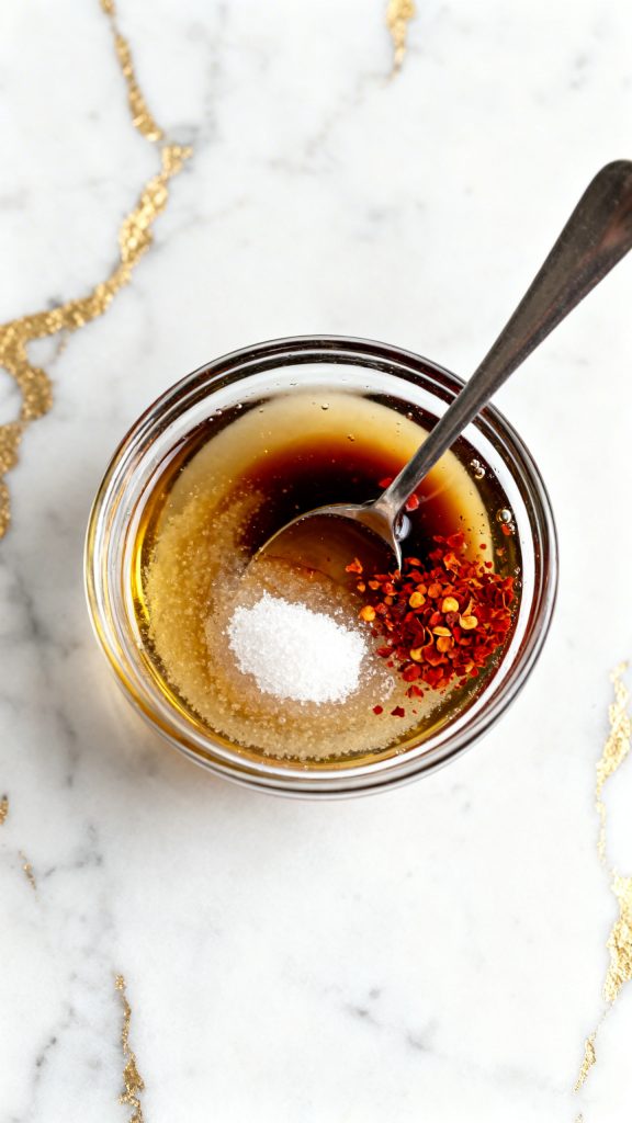 In a small bowl, combine ¼ cup rice vinegar, 1 tablespoon soy sauce, 1 tablespoon sesame oil, 1 tablespoon granulated sugar, and ½ teaspoon red pepper flakes. Stir until the sugar is fully dissolved.