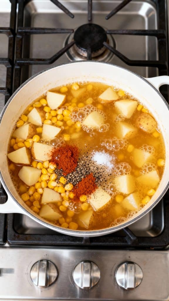 Add 2 cups peeled, diced gold potatoes, 2 cups frozen corn, 4 cups chicken broth, 1 teaspoon smoked paprika, ½ teaspoon salt, and Ÿ teaspoon black pepper. Stir well.