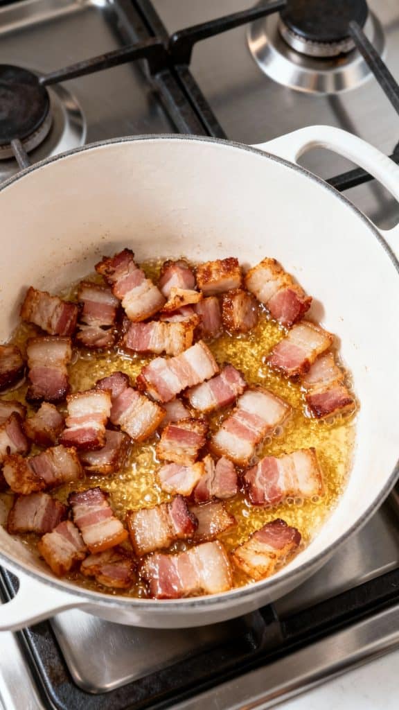 In a large Dutch oven over medium heat, cook 4 slices chopped thick-cut bacon until crispy. Use a slotted spoon to remove and set aside. Leave about 1 tablespoon of bacon fat in the pot.