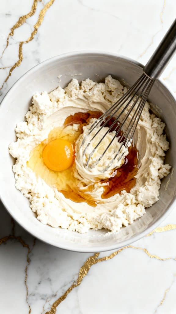 In a bowl, add 1 cup cottage cheese, 1 egg, 1 tbsp maple syrup, and 1 tsp vanilla extract. Whisk until smooth and creamy.