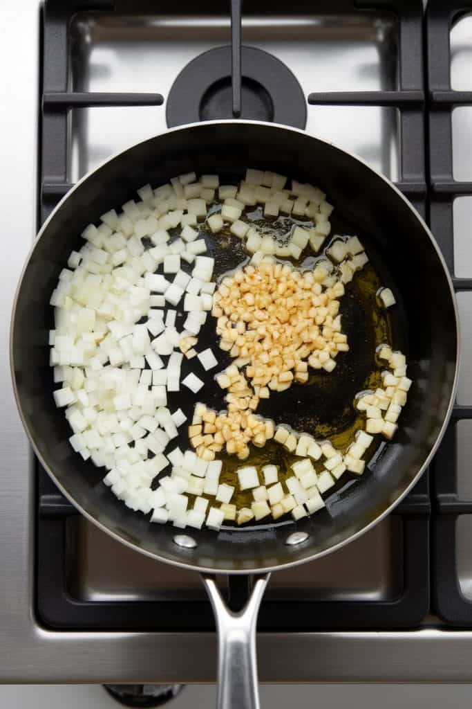 In a skillet over medium heat, add 1 tablespoon olive oil. Sauté 1 small diced onion and 3 minced garlic cloves until soft and fragrant.