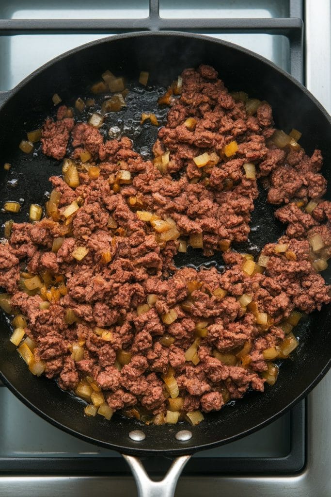 Add 1 pound ground beef to the skillet. Season with 1 teaspoon salt, ½ teaspoon black pepper, 1 teaspoon oregano, and ¼ teaspoon red pepper flakes. Cook until browned and no longer pink.