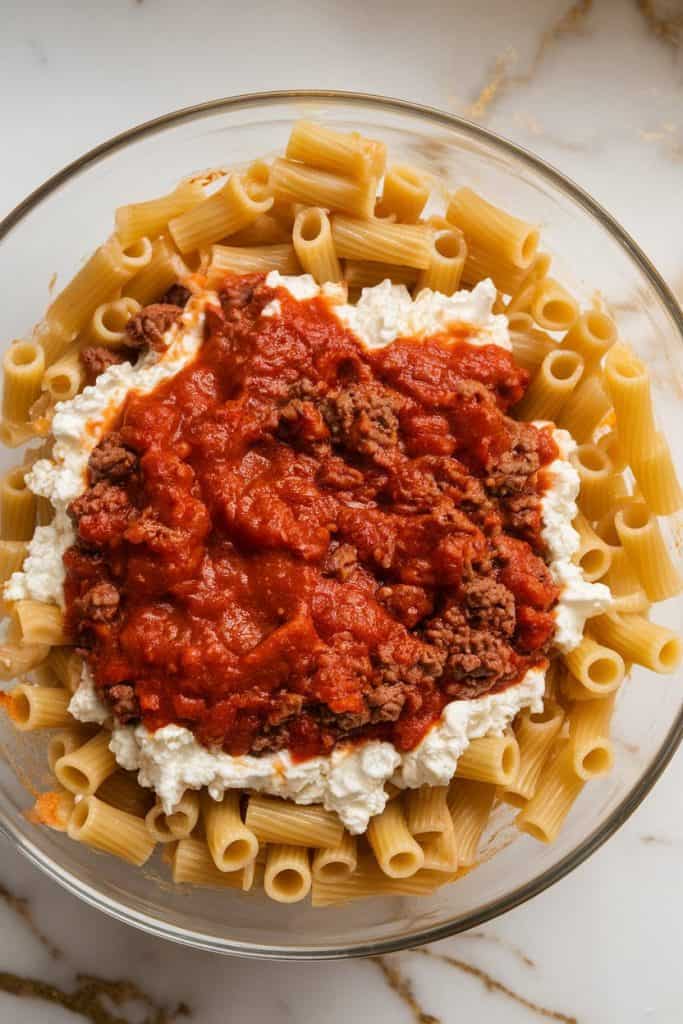 In a large bowl, combine the drained pasta with 1 cup cottage cheese and half the meat sauce. Stir gently to coat.