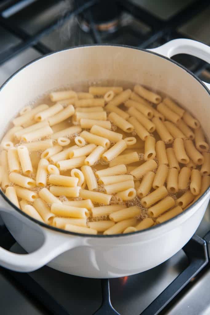Boil 12 oz ziti in salted water until just under al dente, about 1 minute less than package instructions. Drain and set aside.