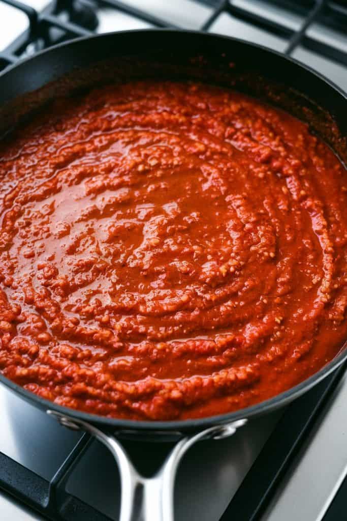 Pour in 24 oz marinara sauce. Stir and simmer the beef mixture for 5 minutes to blend the flavors.