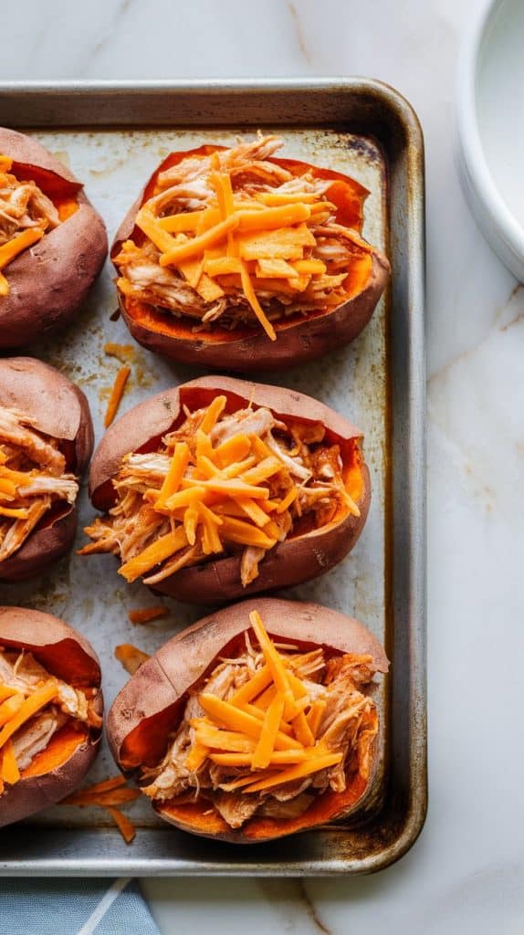 Sweet potatoes are naturally sweet and starchy, and when roasted, they get a caramelized edge that balances perfectly with smoky BBQ sauce. Pairing them with high-protein shredded chicken makes this filling and satisfying. Melting cheese on top adds fat, which helps carry all the flavors even further. It’s basically a flavor bomb in a potato shell.