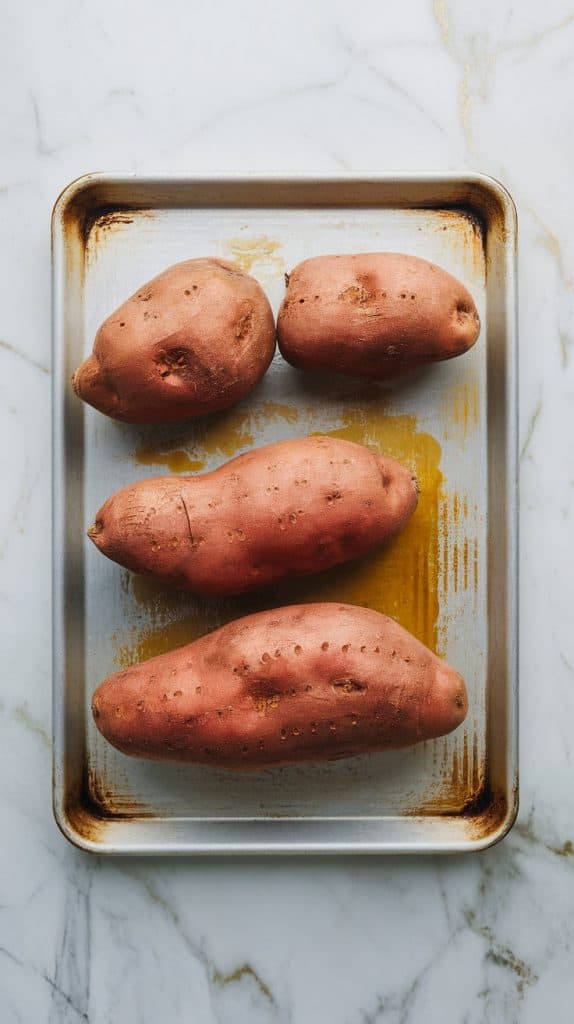 Preheat your oven to 400°F. Wash and scrub 4 medium sweet potatoes. Pierce each one with a fork a few times, rub them lightly with olive oil, and place them on a baking sheet. Bake for 40–45 minutes until fork-tender.