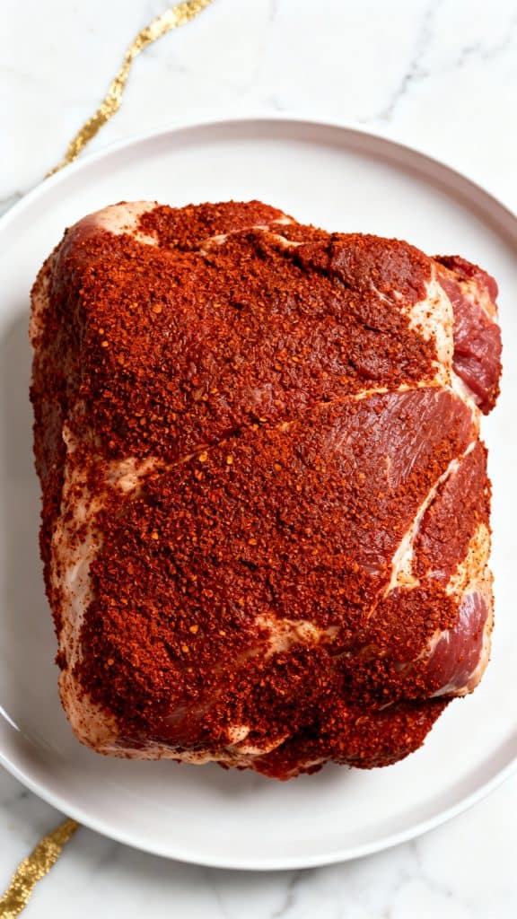 Rub the spice mix all over the 3 lb boneless pork shoulder until it’s fully coated.