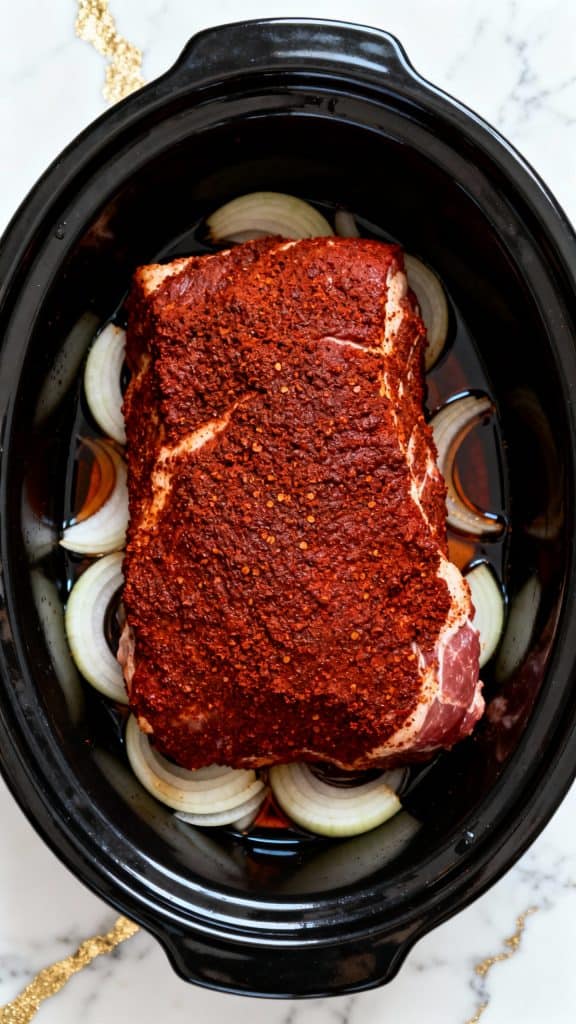Place the sliced onion in the bottom of the crockpot. Add the spice-rubbed pork shoulder on top. Pour 1/2 cup apple cider vinegar and 1/2 cup water around the pork (not directly on top).