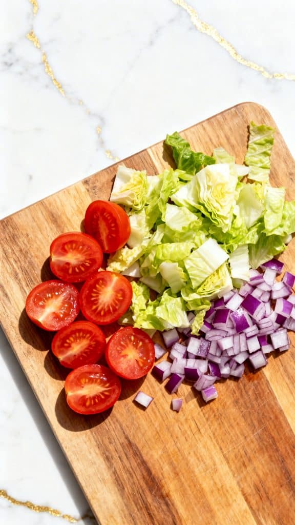 Slice 1 ½ cups cherry tomatoes in half, chop 2 cups romaine lettuce, and finely dice ¼ cup red onion on a cutting board.