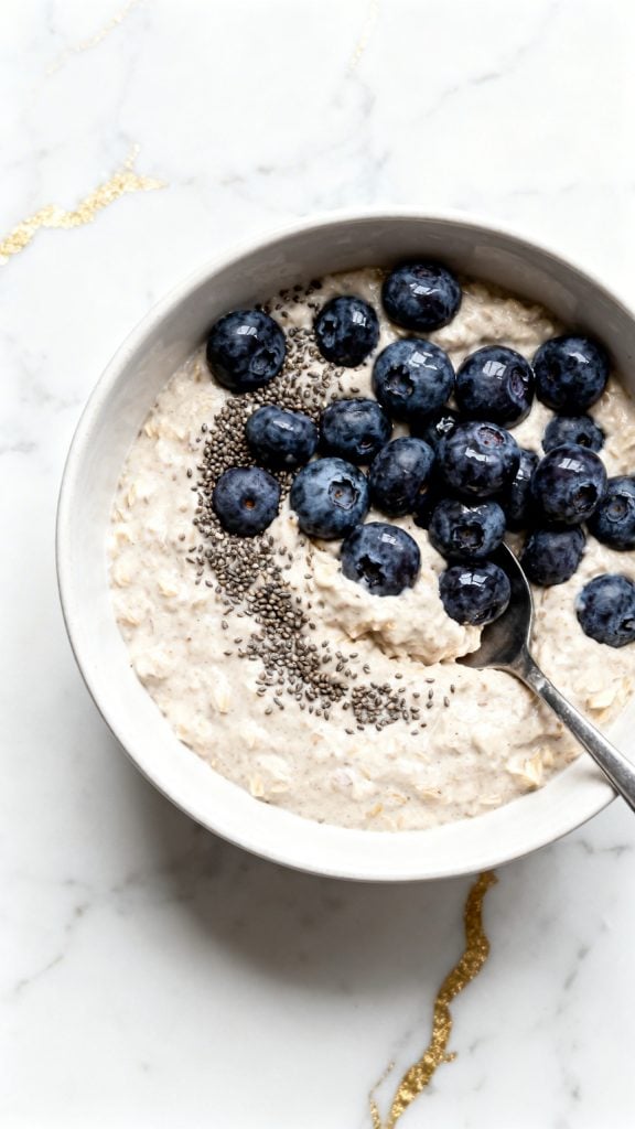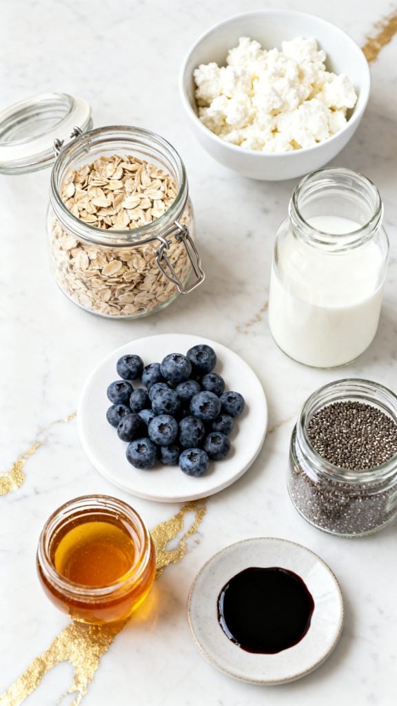 The oats absorb liquid overnight, softening without cooking. Chia seeds help thicken everything by soaking up moisture and forming a gel. Cottage cheese adds protein and blends into a smooth, creamy texture, making the oats richer without extra fat.