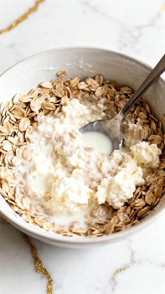 In a bowl, add 1 cup rolled oats, 1 cup cottage cheese, and 1 cup milk. Stir until fully combined and creamy.
