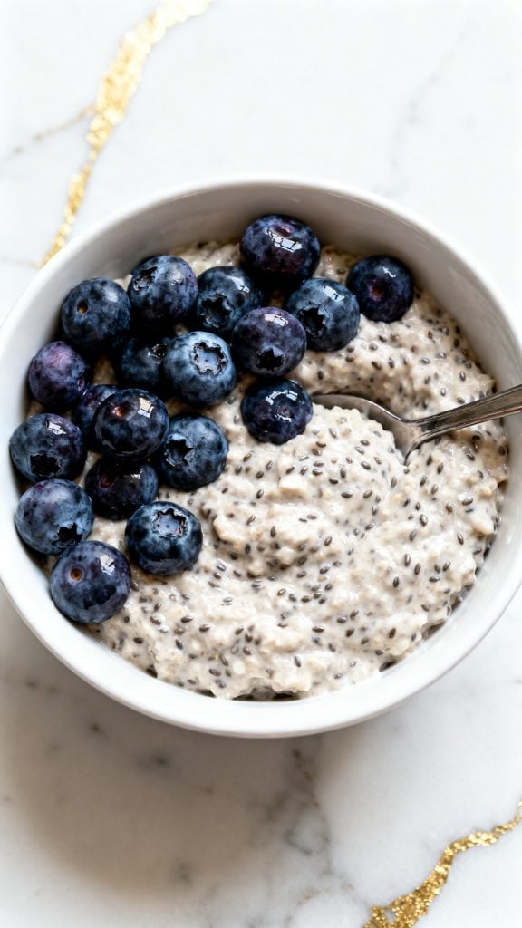 Gently fold in 1 cup fresh blueberries and 2 tablespoons chia seeds.