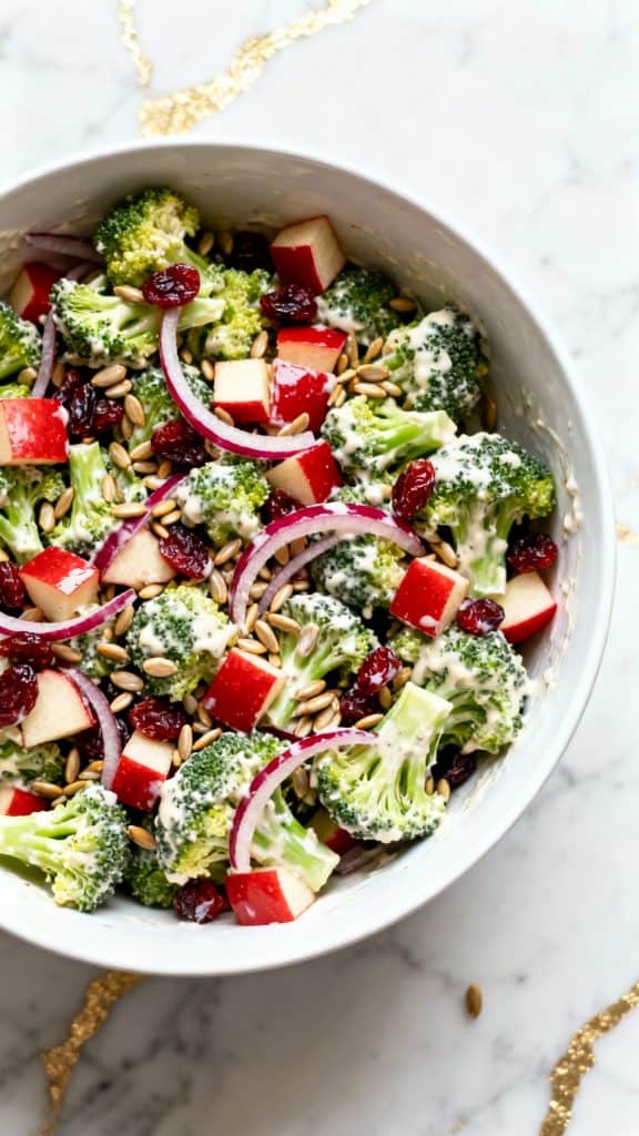 This broccoli salad with apples and cranberries hits all the right notes—sweet, savory, crunchy, and creamy. It’s super easy and always a hit whether you’re serving it up for lunch or bringing it to a party. Give it a shot and don’t forget to grab an extra scoop before it’s all gone.
