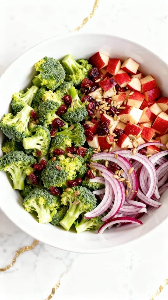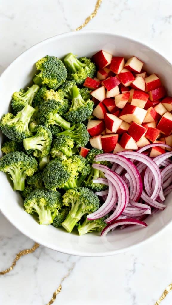 Add 4 cups broccoli florets, 1 diced red apple, and ¼ cup thinly sliced red onion to a large mixing bowl.