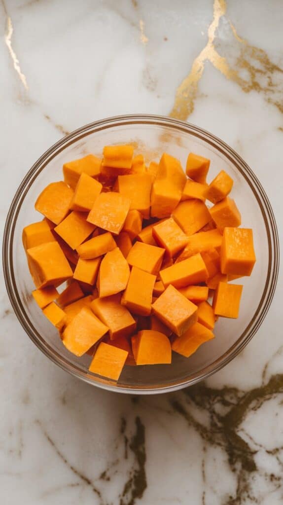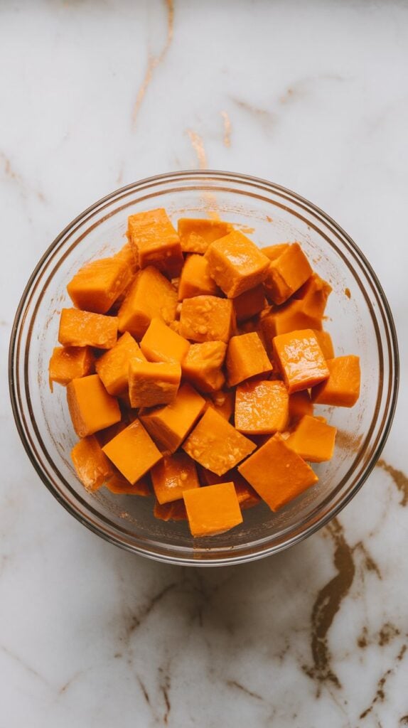 Place 1 large butternut squash (about 3 pounds), peeled, seeded, and cut into 1-inch cubes, into a large mixing bowl.