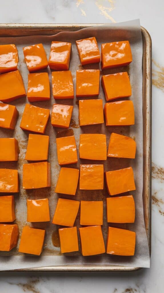 Pour the squash onto the prepared baking sheet and spread it into a single layer, making sure the cubes don’t touch too much.