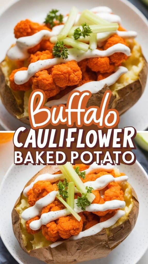 Unwrap the baked potatoes and cut a deep slit down the middle. Fluff the insides with a fork, then top with roasted buffalo cauliflower, a drizzle of vegan ranch, sliced celery, and parsley if using.