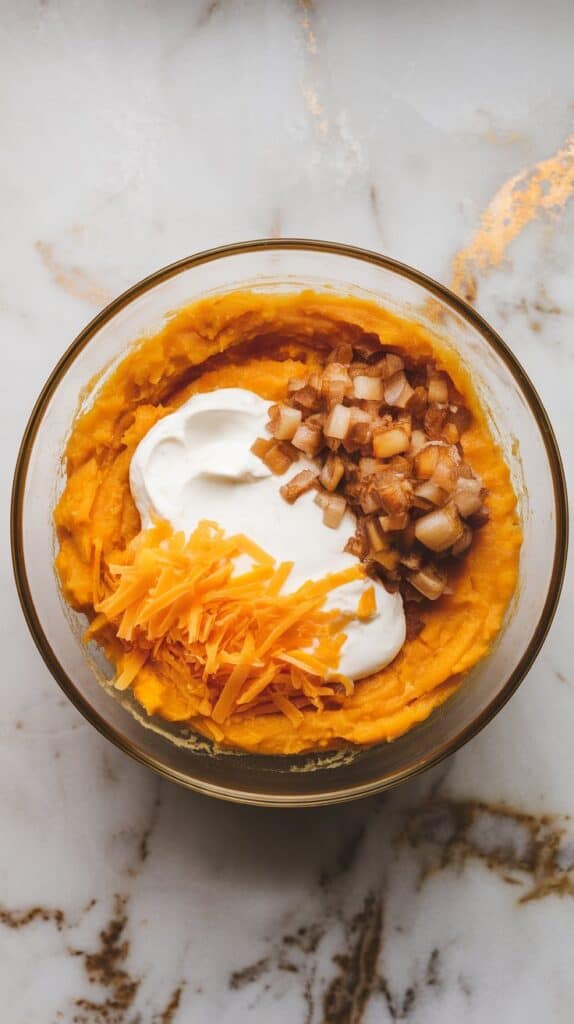 To the mashed squash, add sautéed onion and garlic, ½ cup sour cream, ½ cup shredded cheddar cheese, and 1 beaten egg. Stir until well combined and smooth.