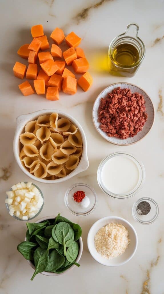You’ve got creamy, roasted squash sauce, juicy bits of sausage, and fresh spinach folded in at the end — all tossed with tender pasta. It’s rich, cozy, and surprisingly simple to pull together on a weeknight.