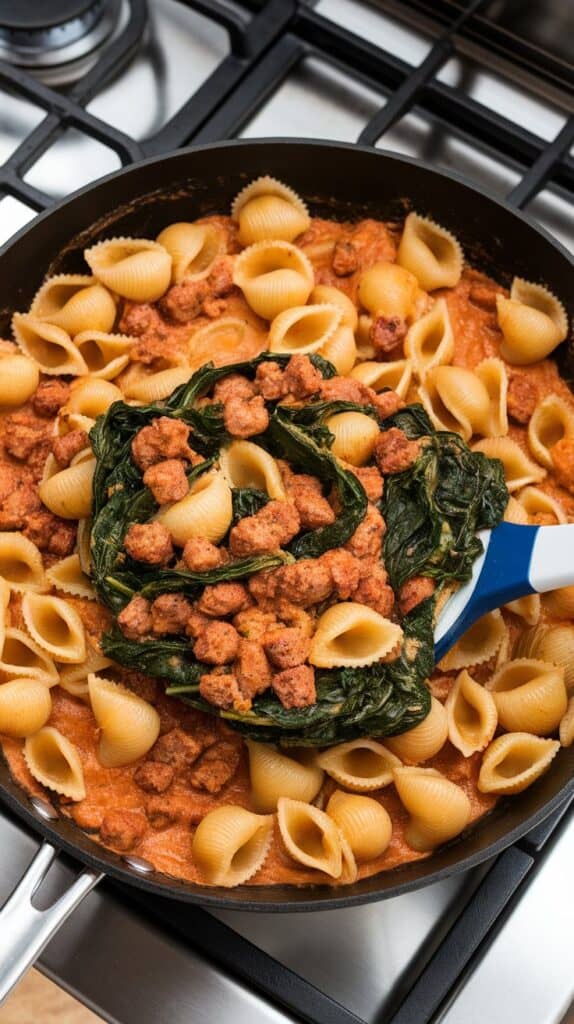 Pour the sauce back into the skillet. Add the cooked pasta, browned sausage, and 2 cups fresh baby spinach. Toss over medium-low heat until everything is coated and spinach has wilted. Add reserved pasta water as needed to thin the sauce.